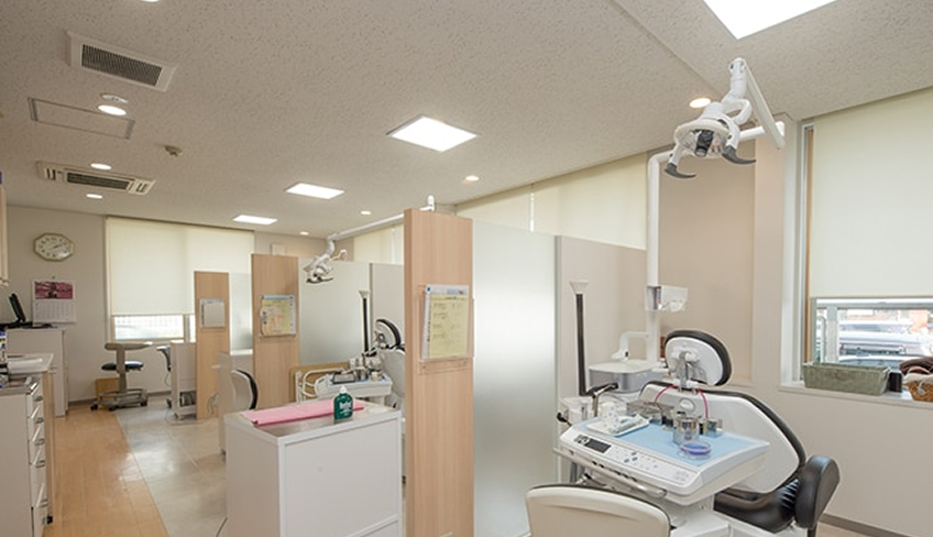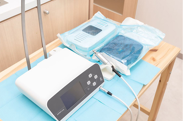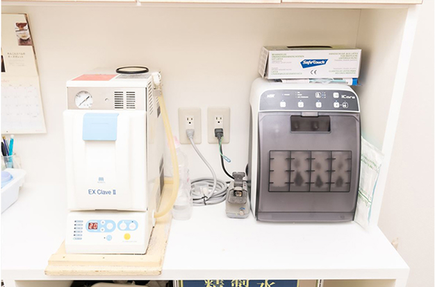 当院では滅菌に力を入れており、大小の滅菌器をご用意することで、滅菌の回転をスピーディーにしております。歯を削るためのタービンなども、一つひとつを滅菌しており、滅菌の不可能なものには使い捨てや消毒などで対応して、院内感染防止のためできるだけの対策を講じております。デジタルレントゲンを用いて、レントゲンよりも10分の1という放射線量を実現しております。また、治療中は明るい診療スペースで、前面の窓ガラスから外を眺めていただけますが、プライバシー保護に配慮したつくりになっております。
