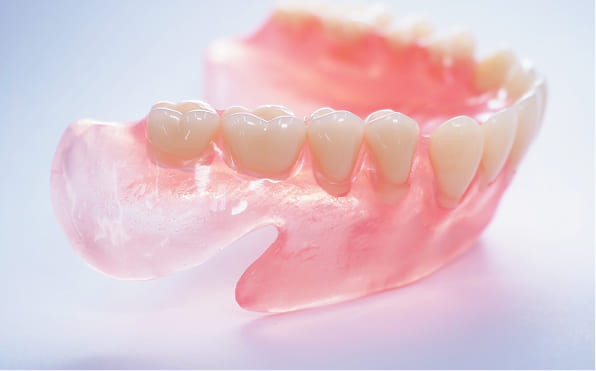 ノンクラスプデンチャーは、金属のバネ(固定具)を使用しない部分入れ歯です。歯ぐきに近い色の素材を使用するため見た目が自然で、入れ歯が目立ちにくいのが特徴です。また、フィット感にも優れており、周囲の歯への負担も比較的少ない入れ歯です。