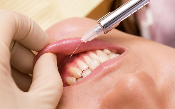 当院では、塗り薬やスプレータイプの表面麻酔を使用し、あらかじめ歯ぐきの粘膜を麻酔します。これにより、麻酔注射を行う際のチクッとした痛みをほとんど感じずに治療を受けていただけます。