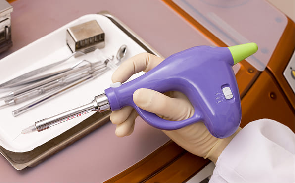 当院では電動麻酔器を導入しており、一定の速度と圧力で麻酔液を注入することができます。これにより、麻酔時の違和感や痛みを抑え、より快適に治療を受けていただけます。